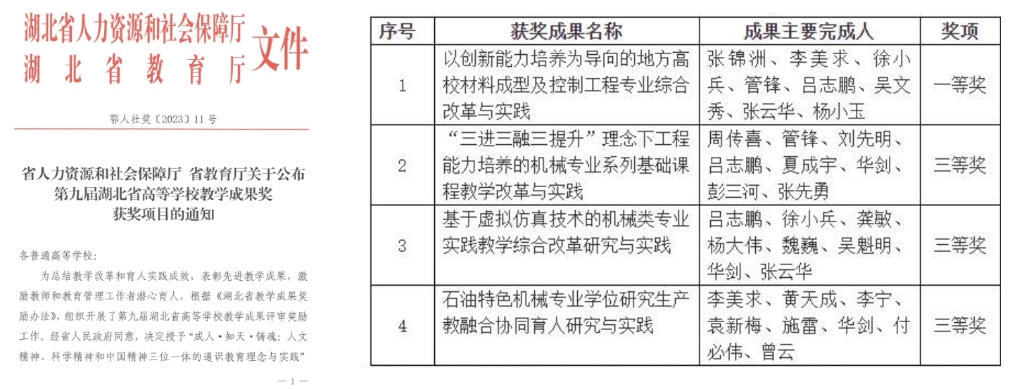 近日,第九届湖北省高等公司教学成果奖获奖项目公布,公司共有4项成果获奖。其中一等奖1项,三等奖3项。获奖数量位居全校第一。