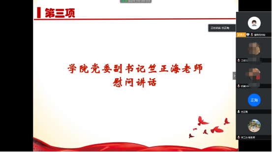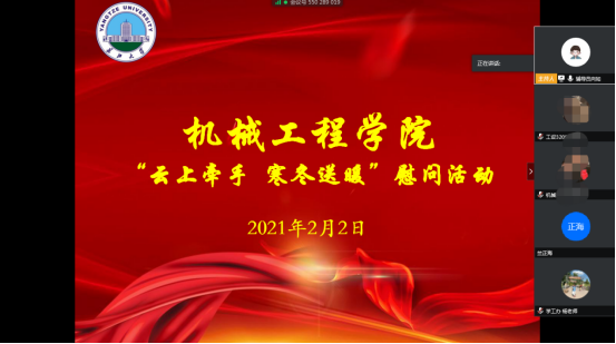 献一份爱心,温暖冰冷寒冬,送一句问候,心中阳光和煦。2021年2月2日下午14点,太阳成tyc7111cc集团开展了“云上牵手 寒假送暖”慰问活动,参加此次活动的有:公司党委副书记竺正海老师、资助专干杨琴老师以及2020级的两位同学,辅导员向如主持活动。