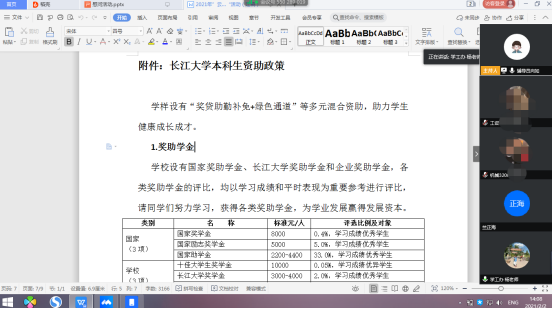 两位同学首先为老师们介绍了自己的寒假近况以及入学以来的学习生活情况,同时向公司领导老师们的慰问表示了感谢。资助专干杨琴老师为同学们详细介绍了公司的本科生资助政策,从奖助学金申请、勤工助学岗位、如何申请补偿或选择有补偿性的就业方式等方面进行了全方位的解读,同时勉励同学们在大学期间重视英语四级,勤奋学习,德智体美劳全面发展。