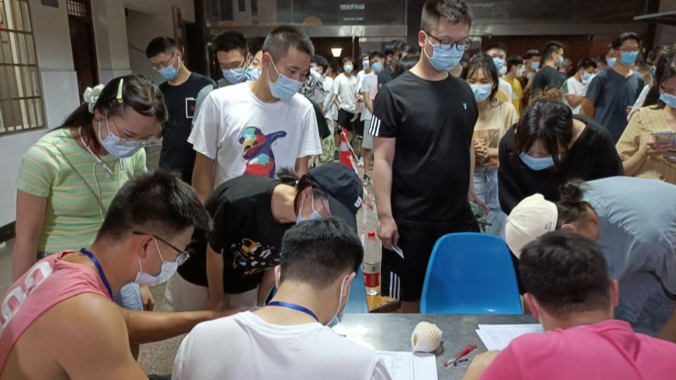 “有校内的同学,有汉科、新风宿舍的同学,还有周边的一些住户,人很多,排起了长龙。”去年上半年,於国旺在家乡黄冈做了一个半月的志愿者,这一次,他有足够的经验,在面对这些情况时,他毫不慌乱。因为是手写登记,且信息量之大,他们6人就轮流进行,一笔一画,一滴滴汗往下掉,手酸了就换下一个上。现场人山人海,他们拿起话筒叫号,有条不紊地对人群进行疏散劝导。他们密切配合,原本嘈杂无序的人群逐渐成了一字长队,大家相互间隔,彼此谦让。