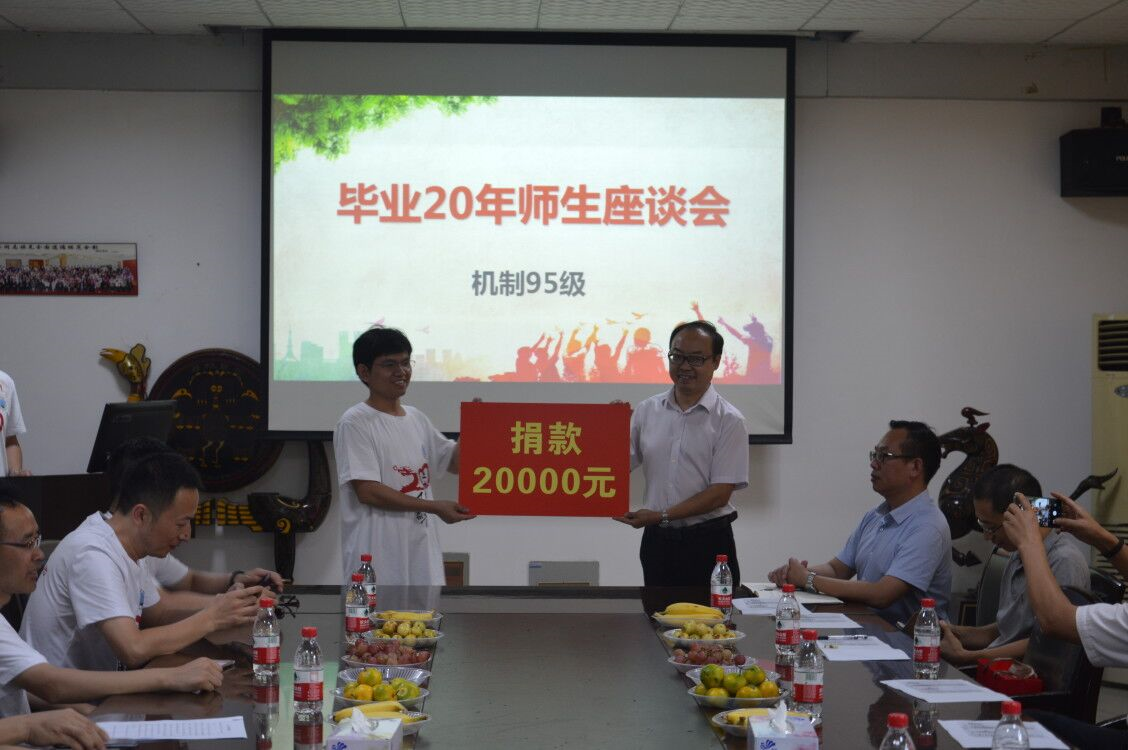 (通讯员向如)10月2日,在公司举办第十一届员工节之际,机制95级员工回母校聚会并捐赠2万元,管锋经理代表太阳成tyc7111cc集团接受捐赠。
