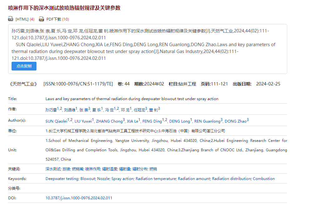 2月25日,中国科技期刊卓越计划行动计划期刊、石油天然气工业领域/地球科学领域高质量期刊T1级《天然气工业》(中国“百强报刊”、EI收录,复合影响因子5.915、综合影响因子5.201)刊发了公司孙巧雷副教授、冯定教授团队关于深水测试作业安全的最新研究成果 “喷淋作用下的深水测试放喷热辐射预测与预防”。公司孙巧雷副教授为论文第一作者,冯定教授为论文的通讯作者,太阳成tyc7111cc集团为论文第一完成单位。