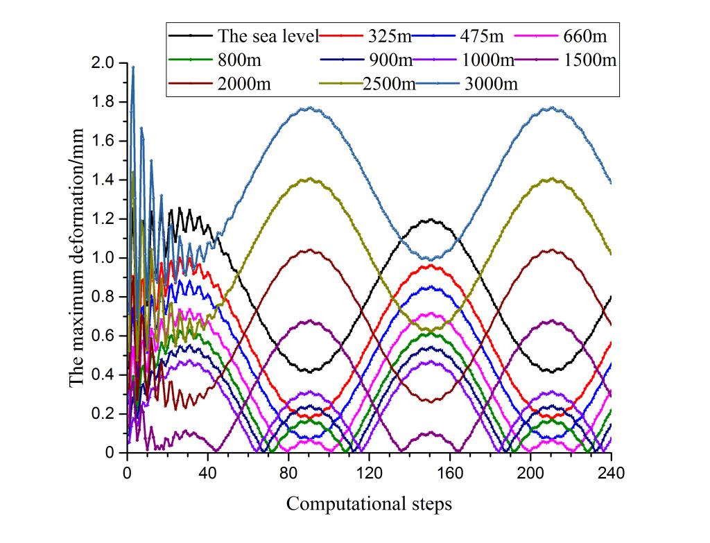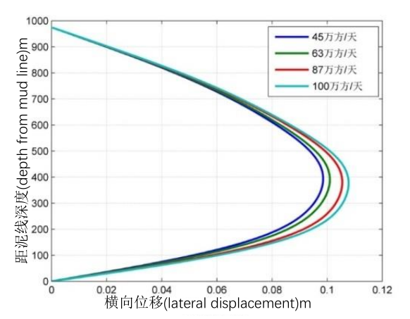 图7 不同产量下的测试管柱最大横向振动位移图8 不同水深处管柱变形随时间步变化的响应