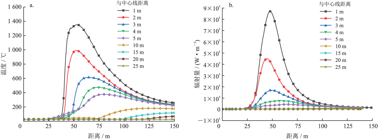 论文根据现场某测试井的实际作业工况,利用喷射小液滴和对称旋转模型模拟放喷喷淋的水幕作用,进行了喷淋作用下的放喷热辐射温度和辐射量分析,掌握了放喷火焰温度、热辐射的主要分布形式,完成了热辐射安全预测范围对比分析。下图为放喷管径对称轴平行线、径向平行线上的温度与辐射量分布规律。