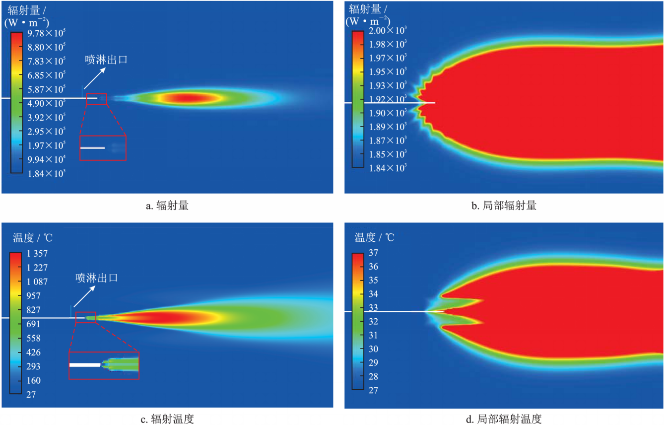 图3 喷淋作用下热辐射温度和辐射量的分布图