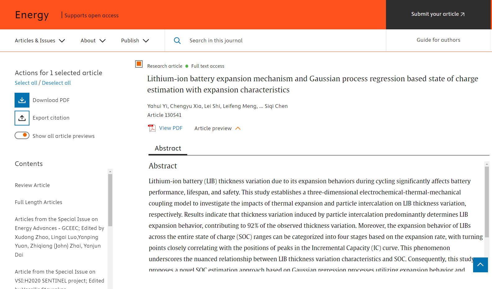 2024年1月31日,中科院一区top期刊《Energy》(《能源》,IF: 9.0)在线刊发了关于锂离子电池膨胀机理的最新研究成果。论文题目为:“Lithium-ion battery expansion mechanism and Gaussian process regression based state of charge estimation with expansion characteristics(锂离子电池膨胀机理和基于高斯过程回归的电荷估计状态)”。公司硕士研究生生伊亚辉、夏成宇教授为论文共同第一作者,钱利勤副教授为论文的通讯作者,太阳成tyc7111cc集团为论文第一完成单位。