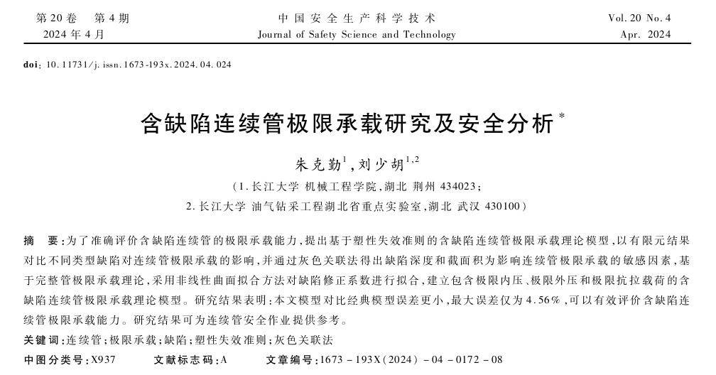 2024年4月30日,国家安全生产监督管理总局主管、中国安全生产科学研究院主办的刊载安全生产科学技术与管理成果的综合性学术期刊T1级《中国安全生产科学技术》刊发了公司刘少胡团队关于连续管作业安全的最新研究成果“含缺陷连续管极限承载研究及安全分析”。公司研究生朱克勤为论文第一作者,刘少胡教授为论文的通讯作者。