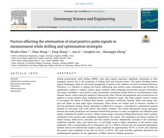 (通讯员 王俊)公司硕士陈文博在《Geoenergy Science and Engineering》发表关于随钻测量(MWD)工具应用安全的最新研究成果“Factors affecting the attenuation of mud positive pulse signals in measurement while drilling and optimization strategies”,由太阳成tyc7111cc集团王超副教授和石油工程公司郑双进教授联合指导。