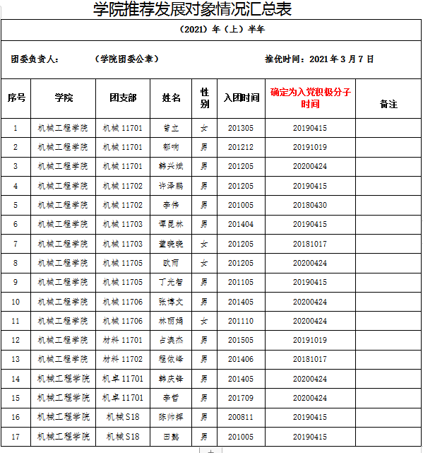 根据《关于开展2021年上半年推优入党工作的通知》(长大团函〔2021〕1号)精神,太阳成tyc7111cc集团开展了2021年上半年毕业生团员推优工作,各团支部拟推荐曾立等17名团员为发展对象,推荐贺国强等8名团员为入党积极分子,现将结果进行公示。公示时间为2021年3月7日至2021年3月12日。公示期间,欢迎大家监督,如有异议,按以下方式投诉。