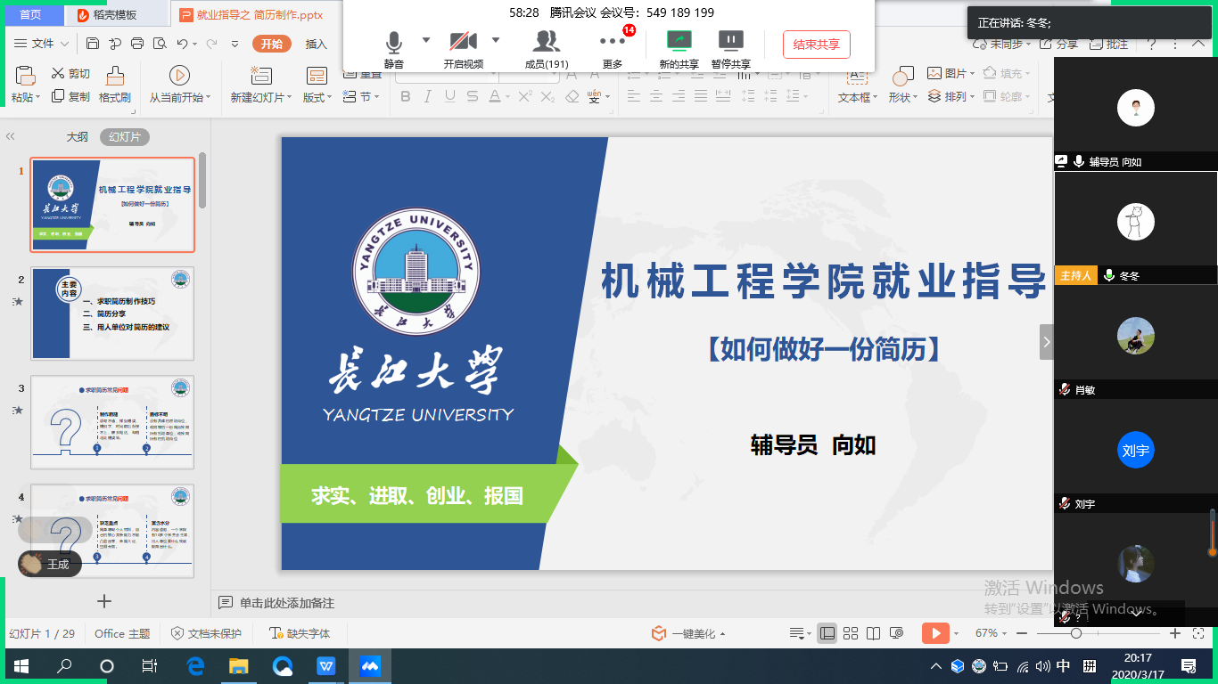 3月17日,太阳成tyc7111cc集团利用腾讯会议为200多名毕业生开展就业“云讲座”,提升员工简历制作能力和面试技巧,辅导员向如、刘冬冬组织此次活动。