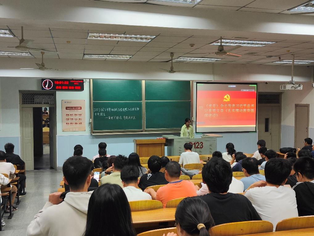 会议在领学人向琼垚的带领下,全体同学集体学习了“庆祝中华人民共和国成立74周年招待会在京举行 习近平发表重要讲话”、“《求是》杂志发表习近平总书记重要文章《扎实推动教育强国建设》”、“习近平致信全国优秀教师代表强调大力弘扬教育家精神为强国建设民族复兴伟业作出新的更大贡献向全国广大教师和教育工作者致以节日问候和诚挚祝福”、“习近平给东北大学全体师生回信强调着眼国家战略需求培养高素质人才为推动东北全面振兴推进中国式现代化作出新的更大贡献”等8个讲话内容。随后,向琼垚就推动教育强国建设这一主题,组织成员们开展主题研讨。